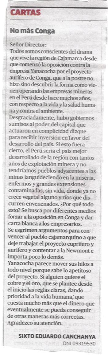 Lea la carta enviada por el Sr. Sixto Eduardo Canchanya al diario La República el 23/08/2012; hacer Click en el siguiente enlace:
